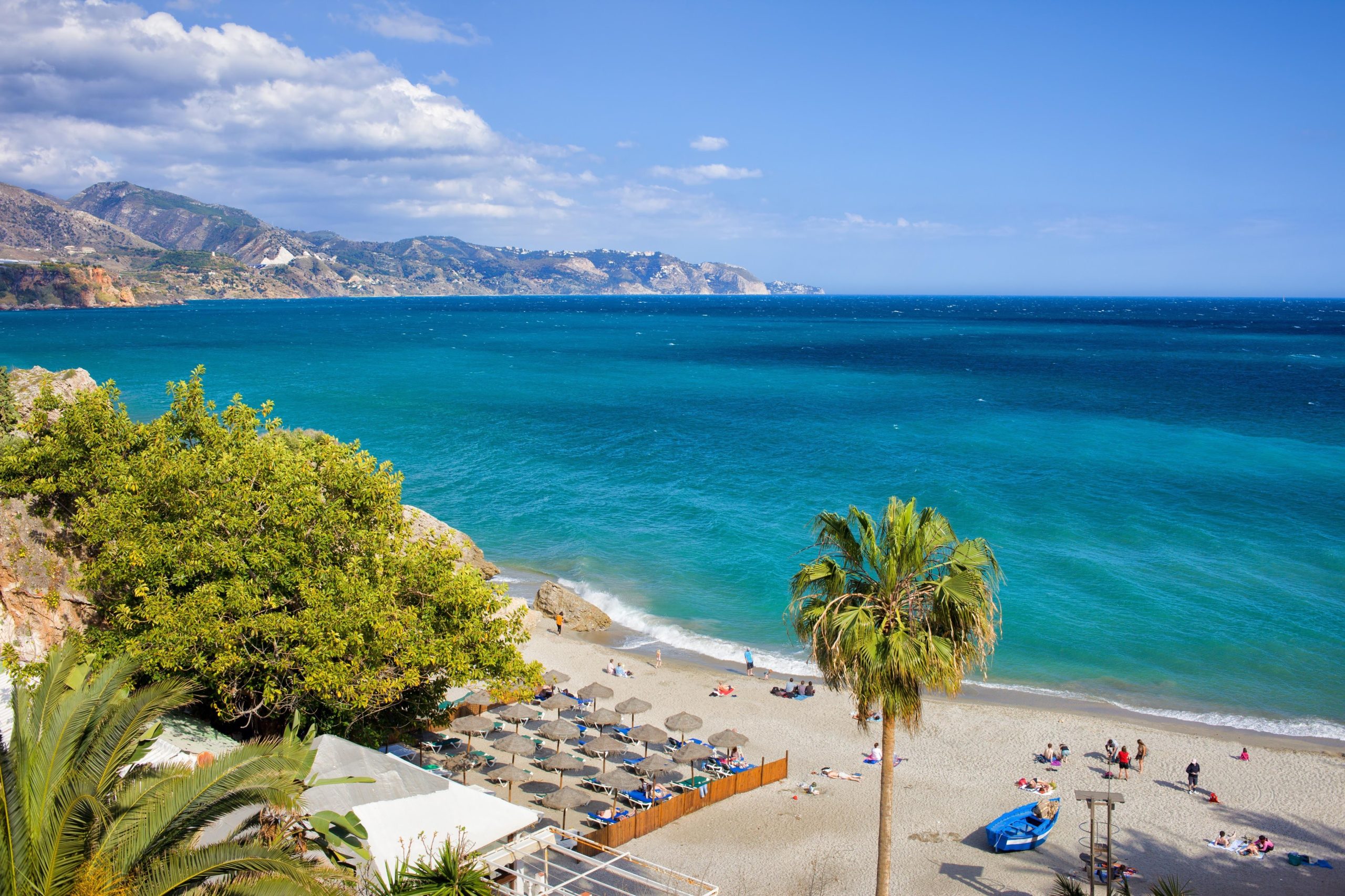 Nerjas berühmtester Strand, der einen breiten Sandstrand mit einer belebten Promenade, Wassersportmöglichkeiten und renommierten Paella-Restaurants bietet.